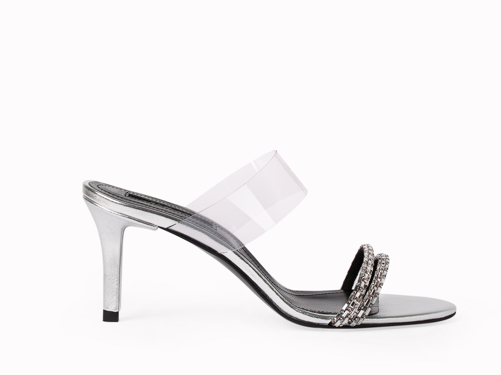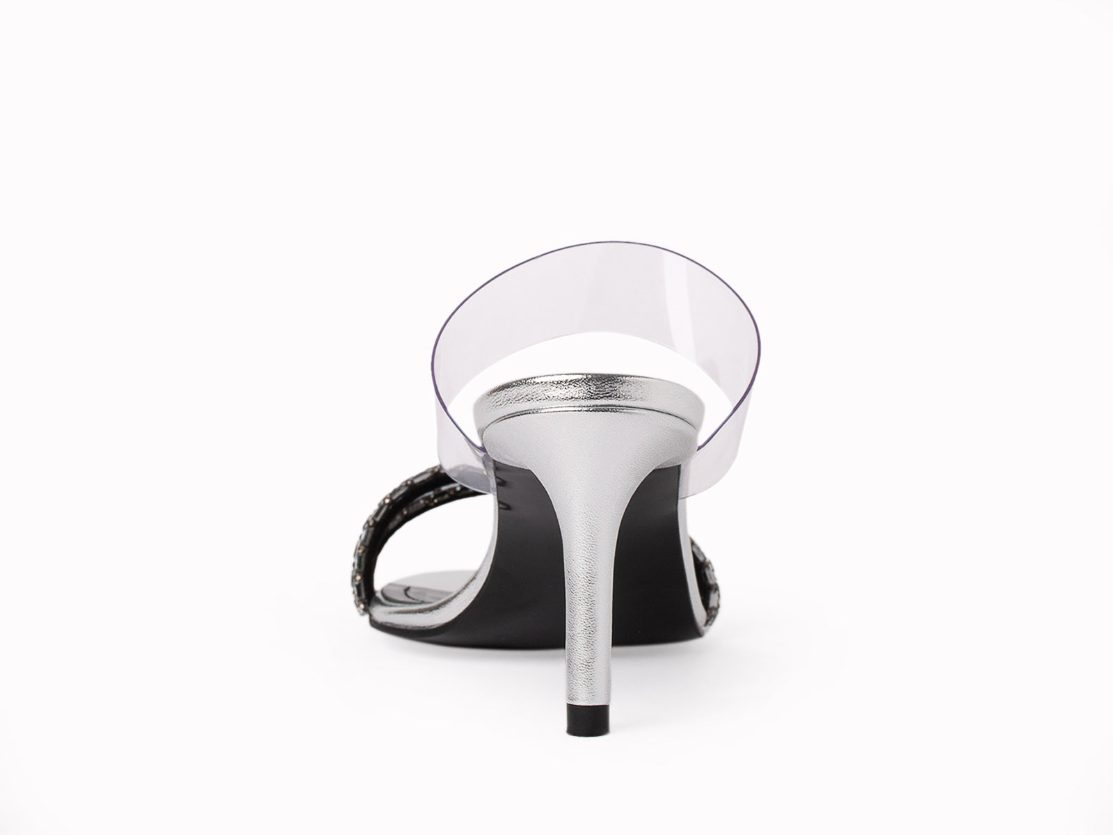 Our Amina mules design are one of the most coolest style this year. Crafted from silver leather , transparent vinyl and an amazing touch of crystals.